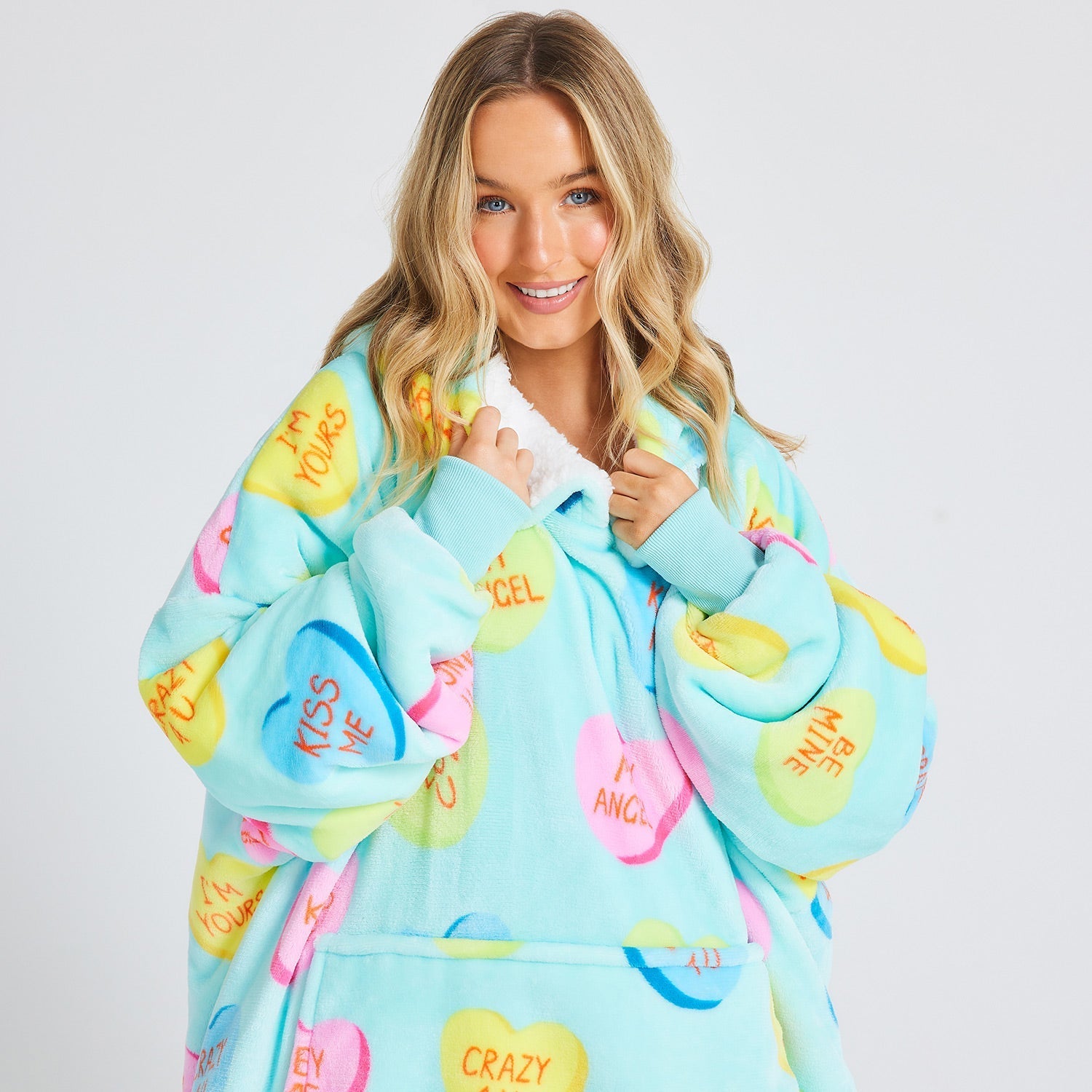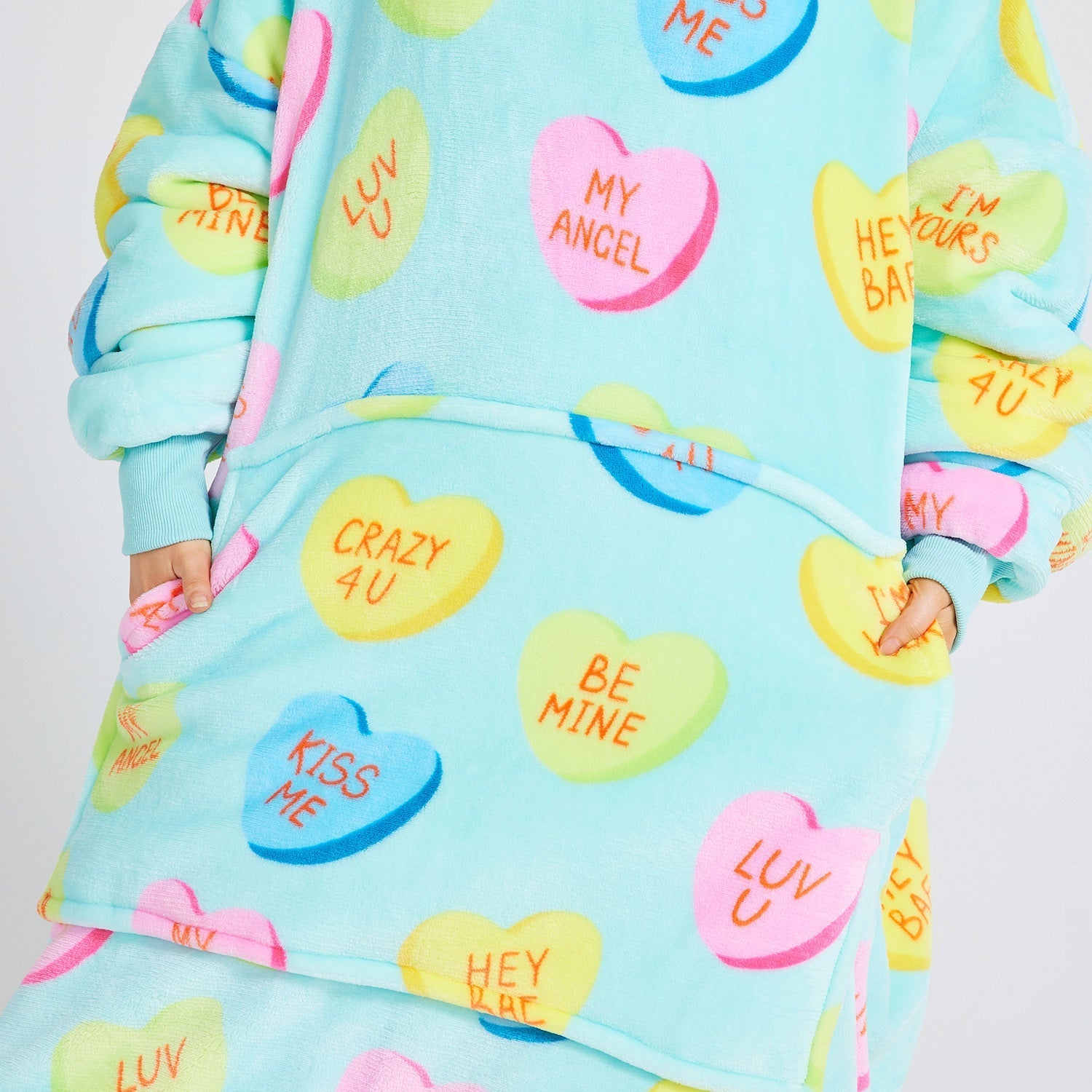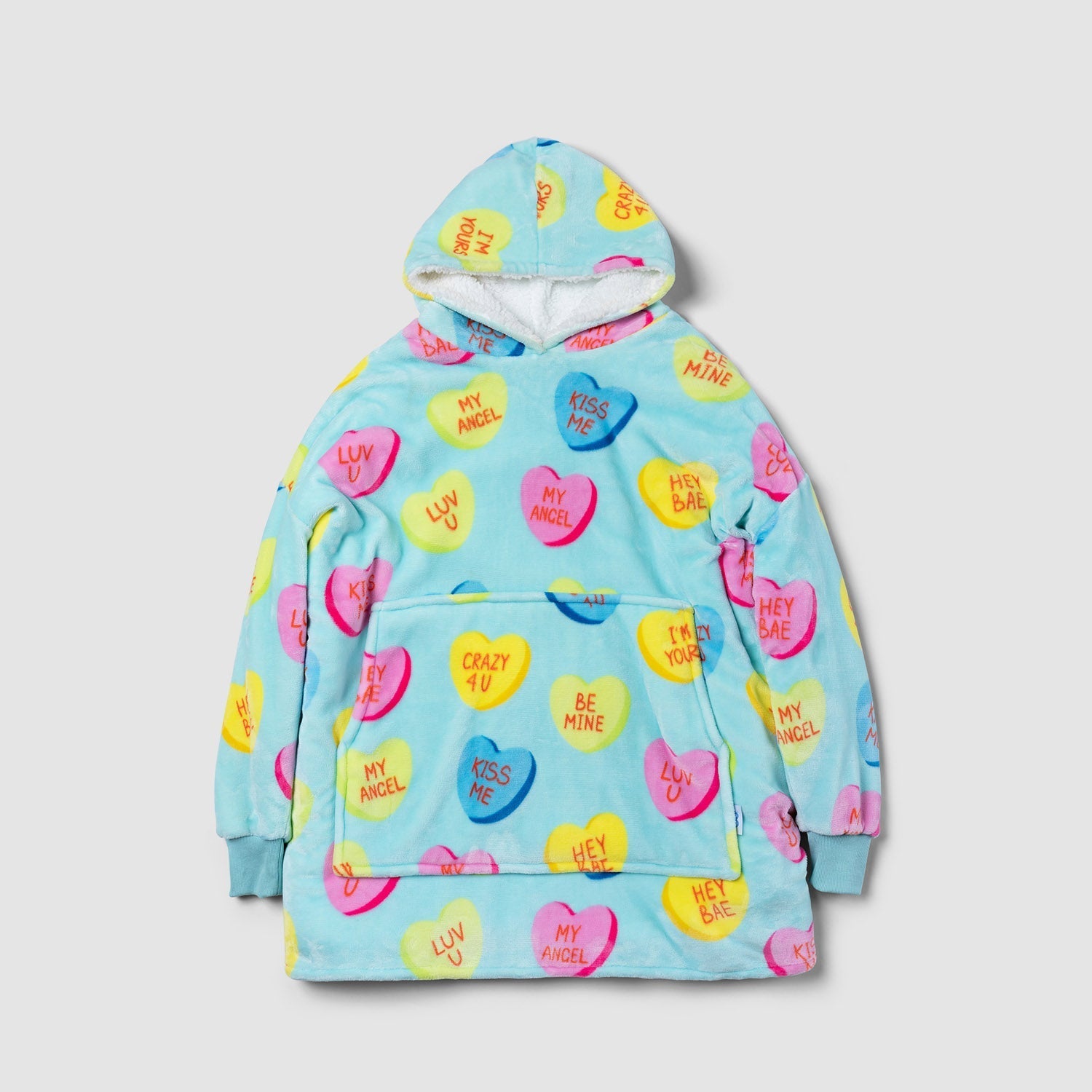 - Wear your heart on your sleeve (literally) with the Love Heart Candies Oodie! Covered in adorable heart-shaped candies with lovable messages like: Luv U, My Angel, I’m Yours & more.